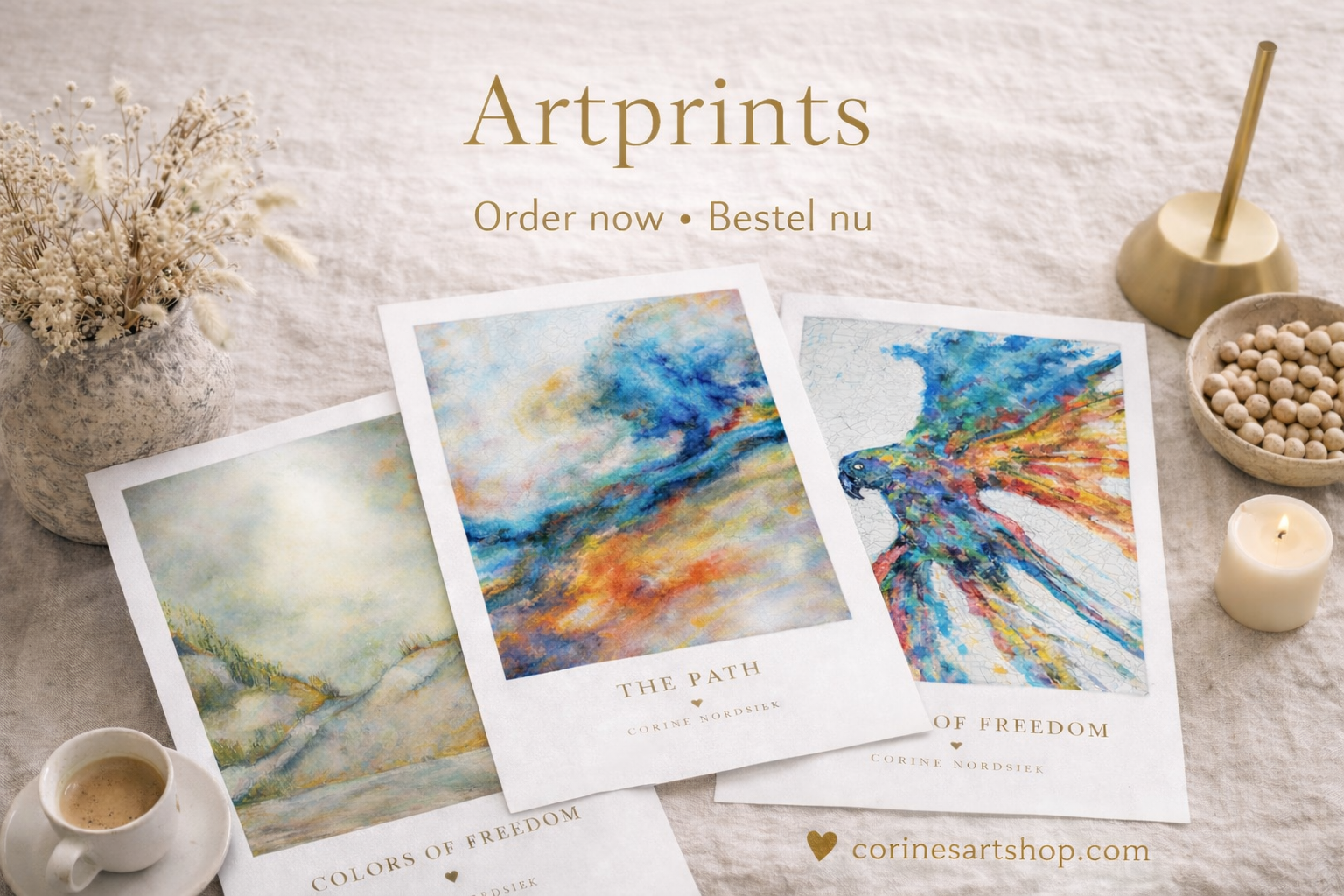 Welkom in mijn kleurrijke wereld vol liefde en creatie! ik ben Corine Nordsiek, een gepassioneerde kunstenares en paranormaal medium met een achtergrond in interieurstudies. Mijn webshop is ontstaan uit een diep verlangen om liefde positiviteit en schoonheid in de wereld te brengen. Met veel uren en toewijding heb ik deze unieke ruimte gecreëerd, waar je kunst vindt die niet alleen esthetisch mooi is, maar ook een fijn en liefdevol gevoel oproept als aansluiting op mijn youtube vol met spiritualiteit gecombineerd met allerlei kunstvormen. Visueel beeldend neem ik het publiek mee in fantasythema's gecombineerd met boodschappen van de engelen en lichtwezens.